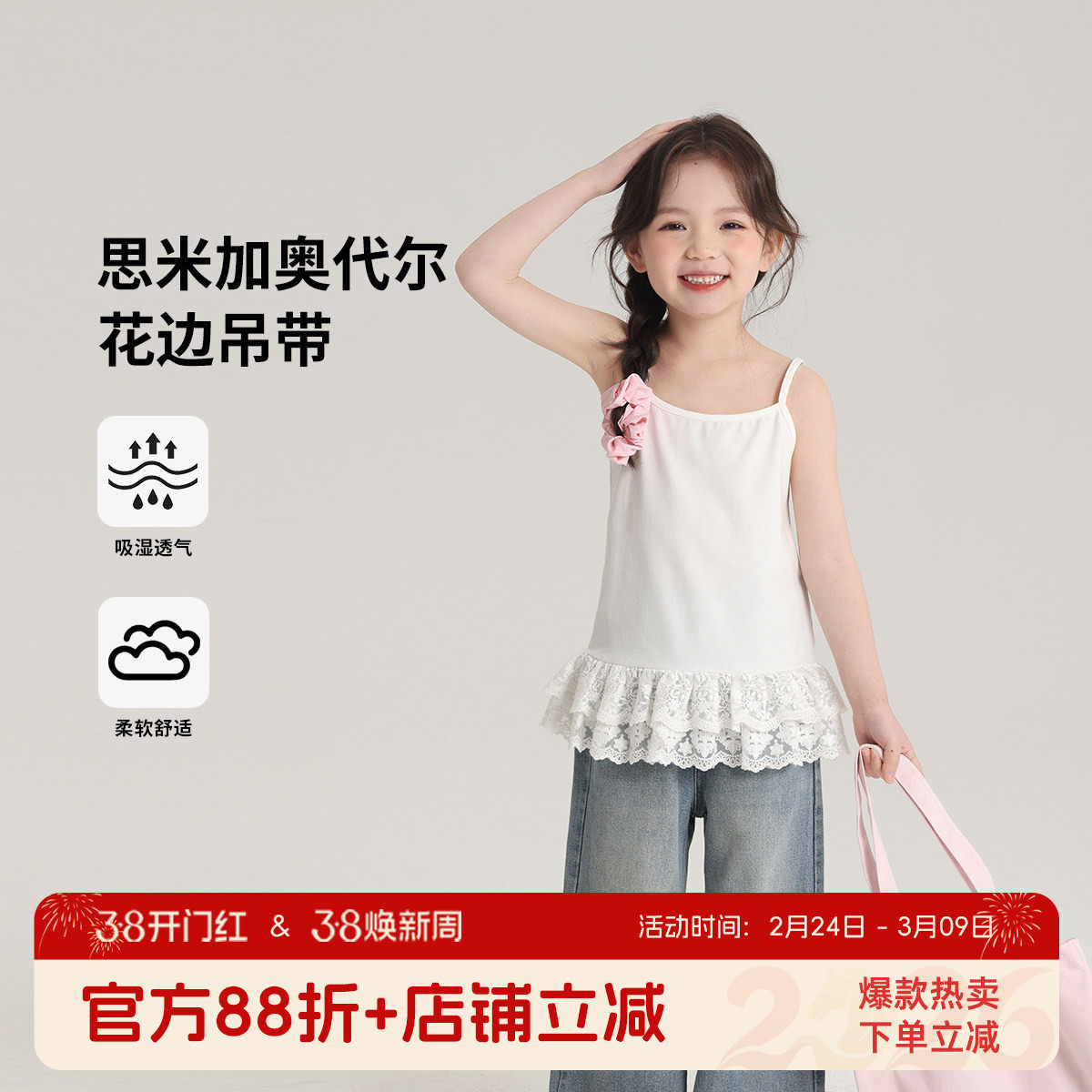 布丁哈鲁童装女童休闲上衣2026新款春秋无袖白色蕾丝花边吊带背心