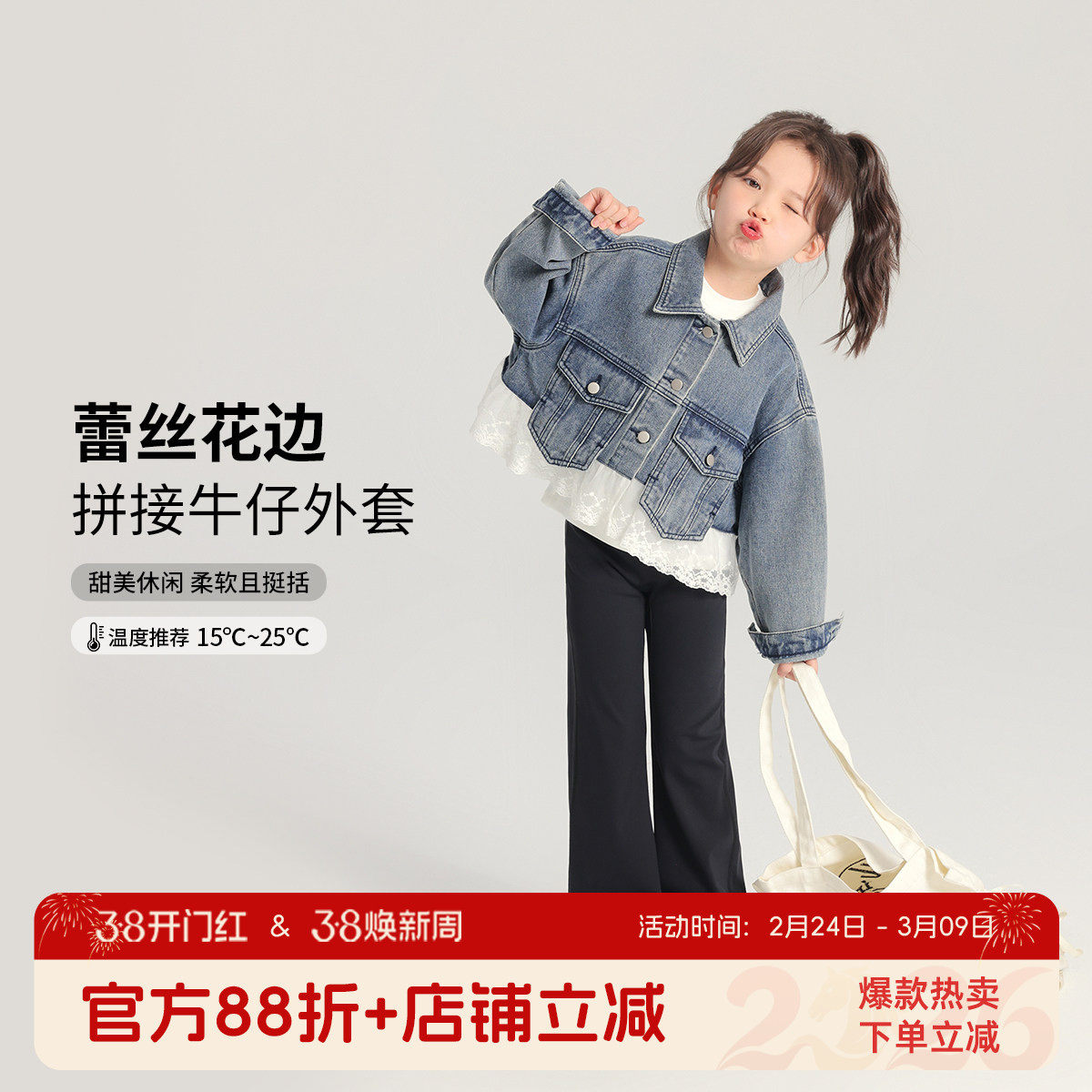 布丁哈鲁春装女童上衣2026春秋新款儿童百搭蕾丝花边牛仔外套