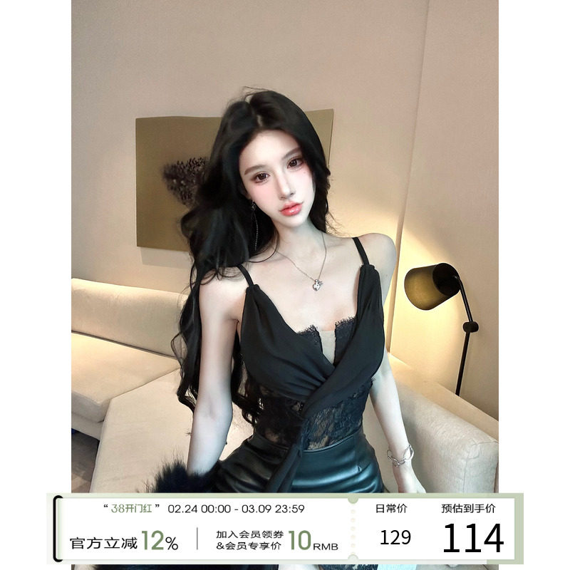 【现货】灰尘邓邓 辣妹套装女秋蕾丝拼接吊带上衣半身皮裙两件套