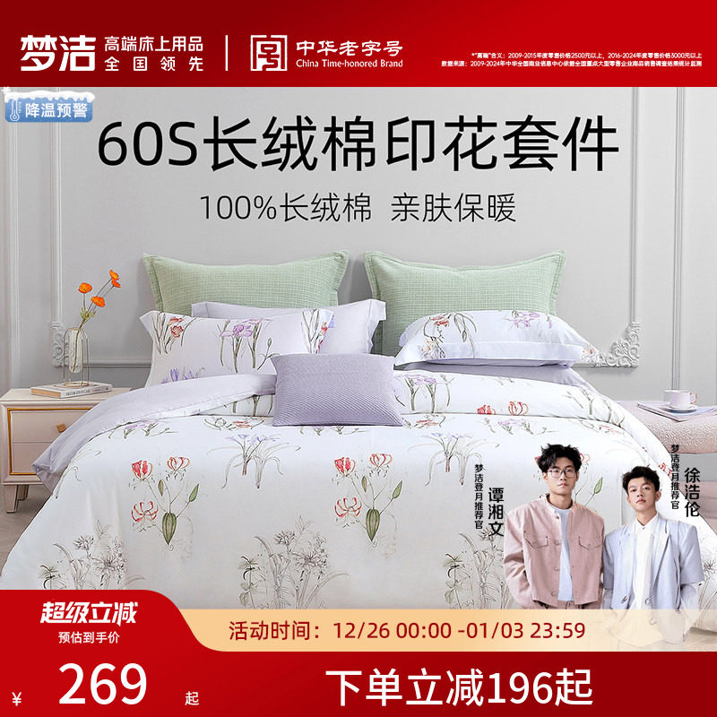 梦洁家纺床上三四件套纯棉套件60S长绒棉印花家用学生床上用品