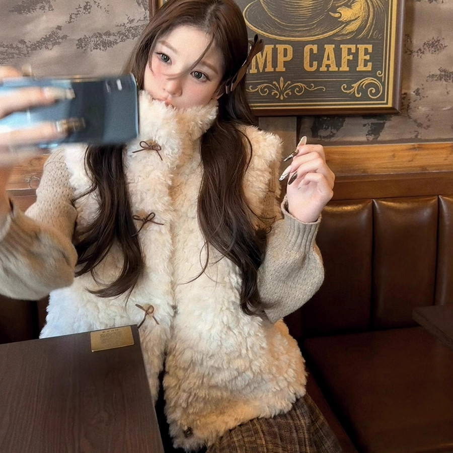 环保毛毛马甲女短款2025秋冬新款仿皮草羊羔毛保暖毛绒蝴蝶结背心