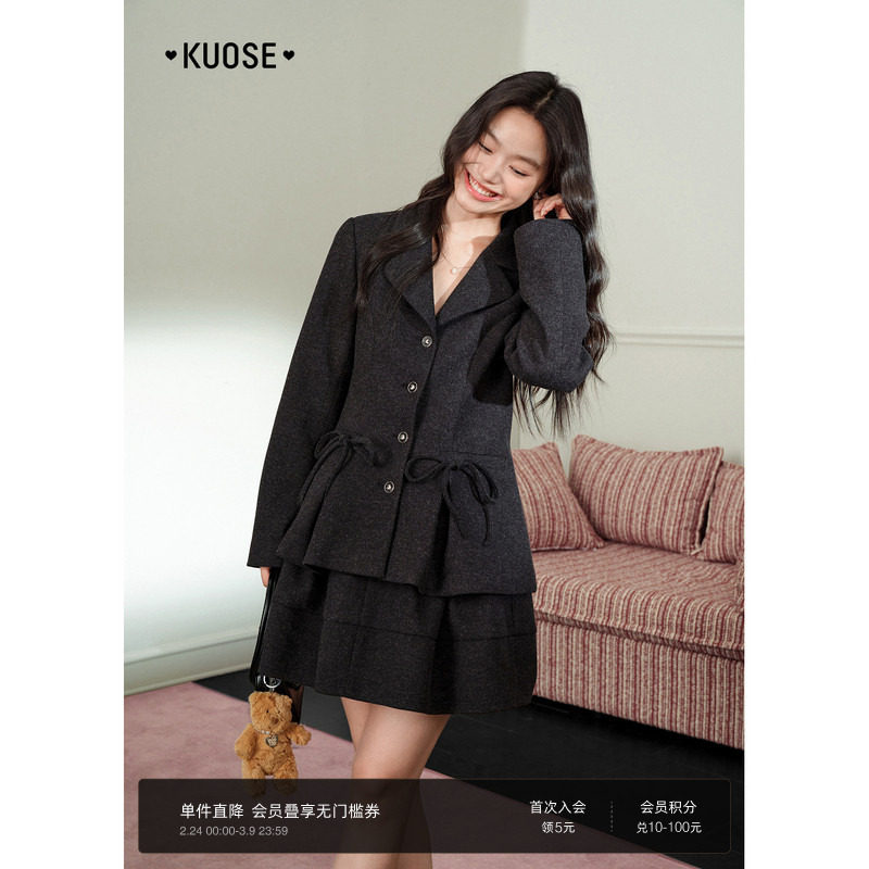 阔色黑灰色西装修身外套花苞半身裙两件套装女25秋冬新款呢子大衣