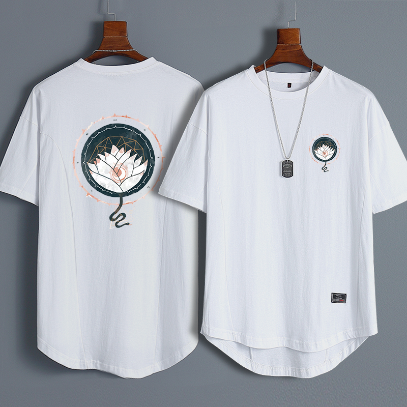 中国风纯棉t恤男白莲花短袖宽松大码五分袖前短后长蝙蝠衫落肩潮