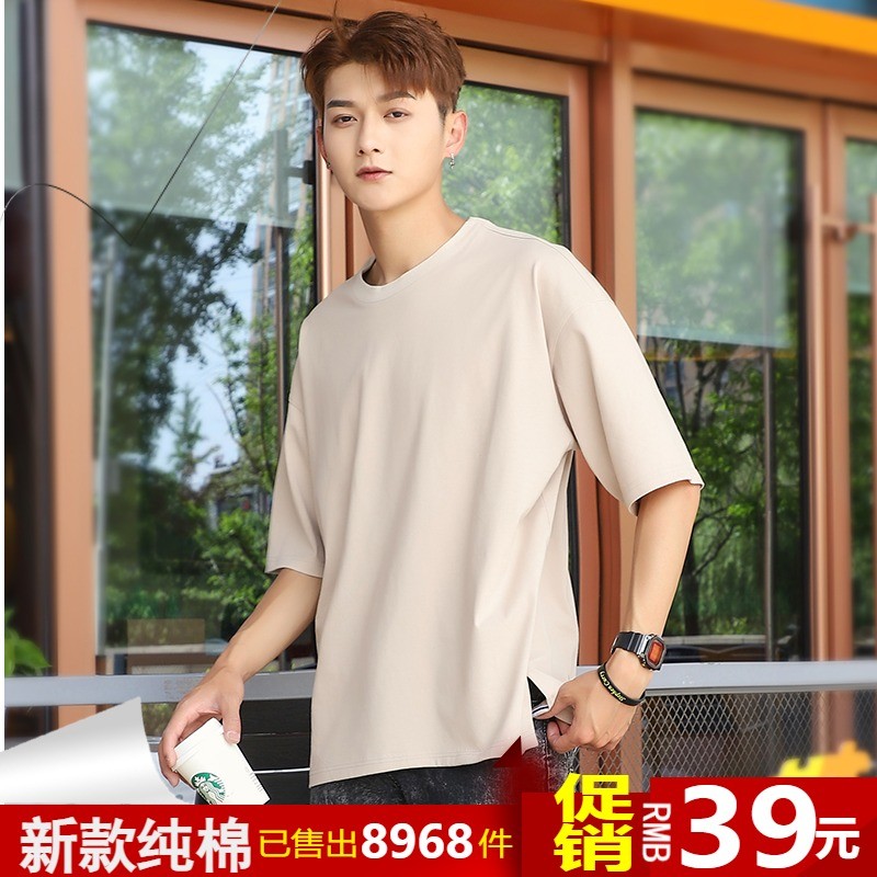 百搭男士宽松短袖夏季五分袖蝙蝠衫开叉T恤青年纯棉圆领汗衫大码