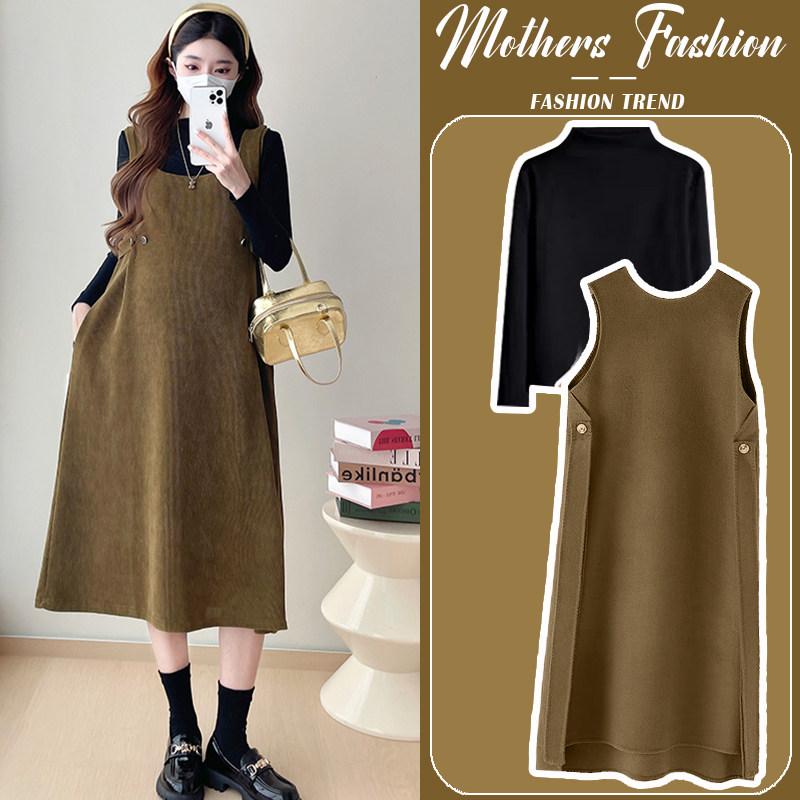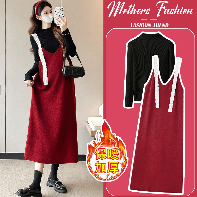 孕妇连衣裙套装秋冬2025新款孕妈减龄加厚保暖背带裙打底衫两件套