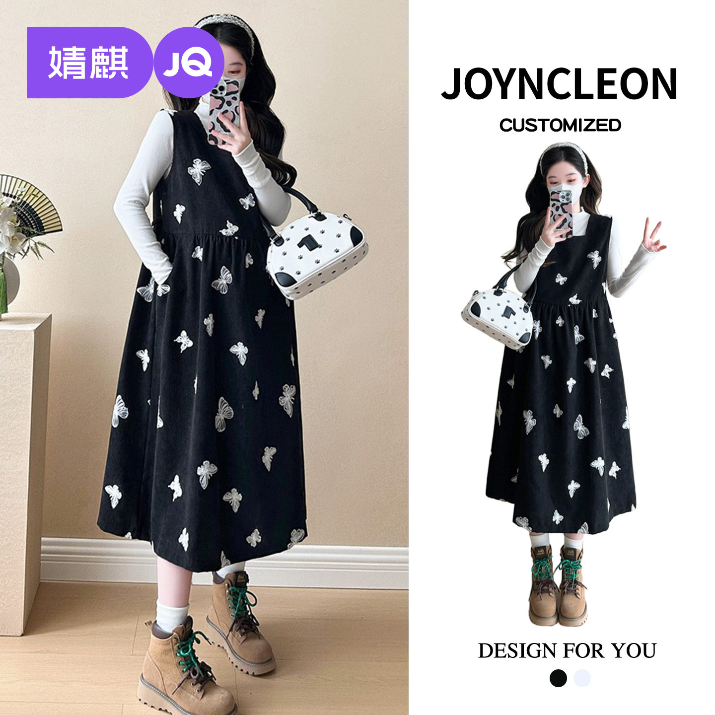 婧麒孕妇装连衣裙2025新款秋冬洋气宽松蝴蝶刺绣背带裙两件套装