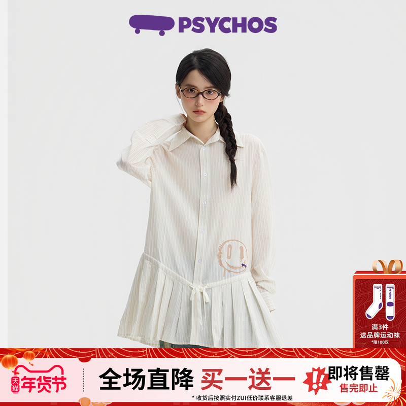 【买一送一】PSYCHOS莎可斯条纹衬衫裙裙笑脸涂鸦纯棉百褶连衣裙