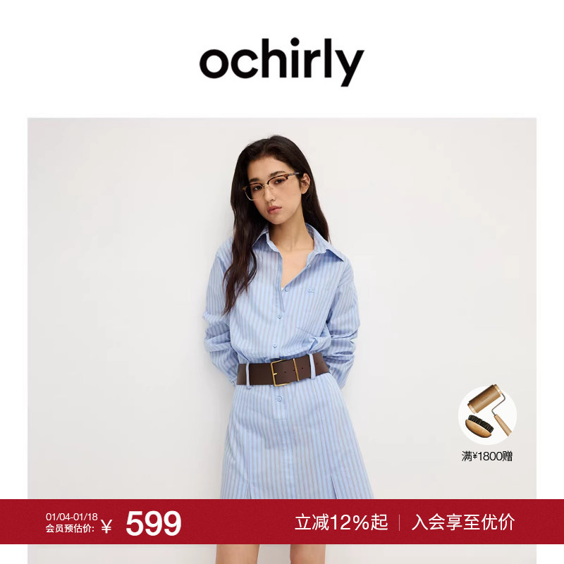 【季末折扣】欧时力条纹衬衫裙连衣裙复古通勤腰带航海系2025秋新