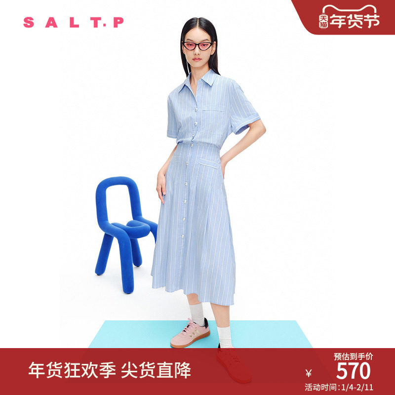 SALT.P可颜双层撞色翻领收腰显瘦条纹衬衫裙连衣裙2024夏