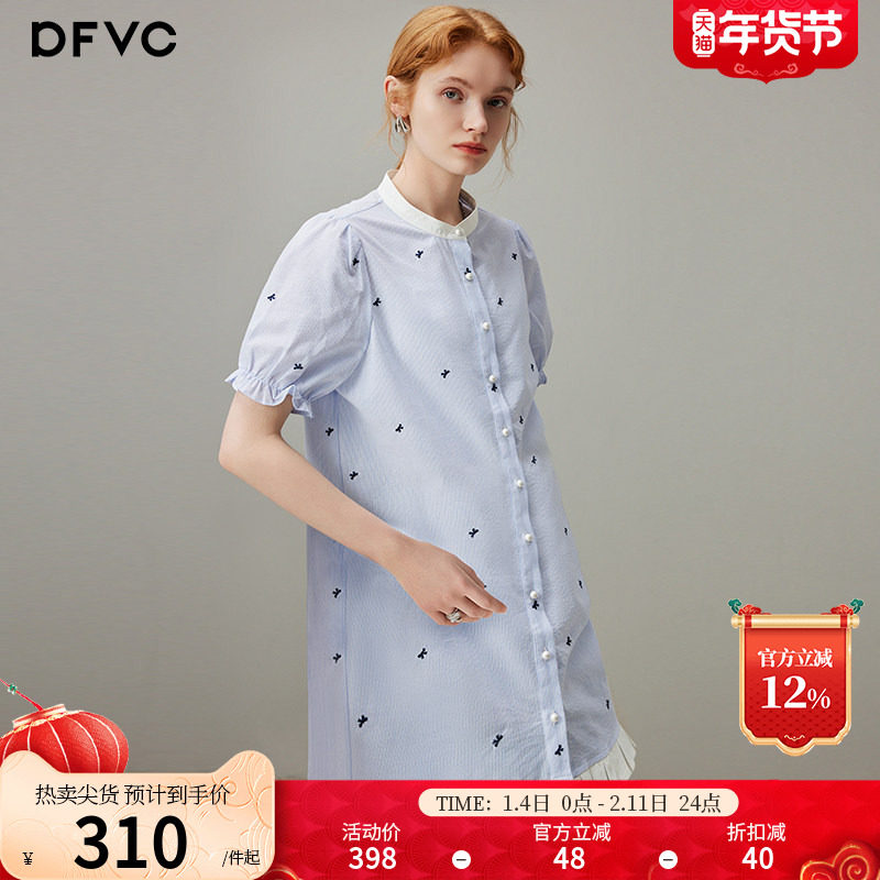 dfvc温柔风纯棉条纹衬衫裙女2025年夏季新款灯笼袖宽松绣花连衣裙