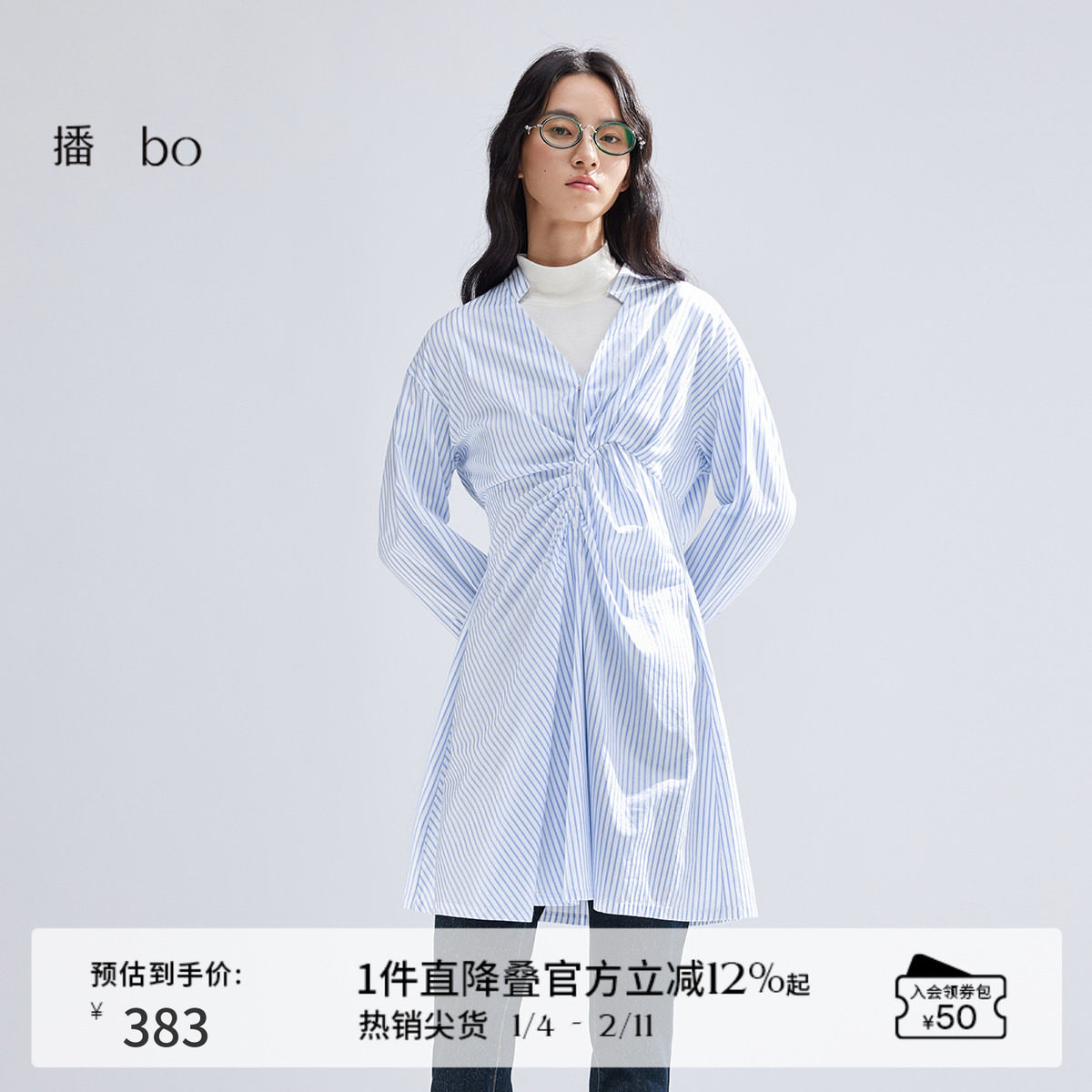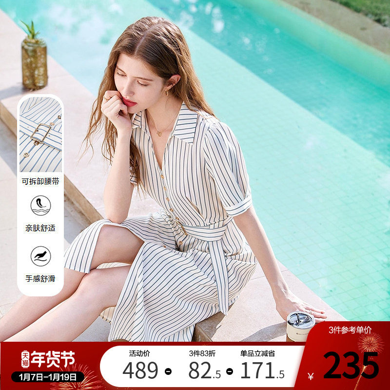 播 bo 商场同款条纹衬衫裙女春夏优雅短款收腰a字裙BDR1LD2225