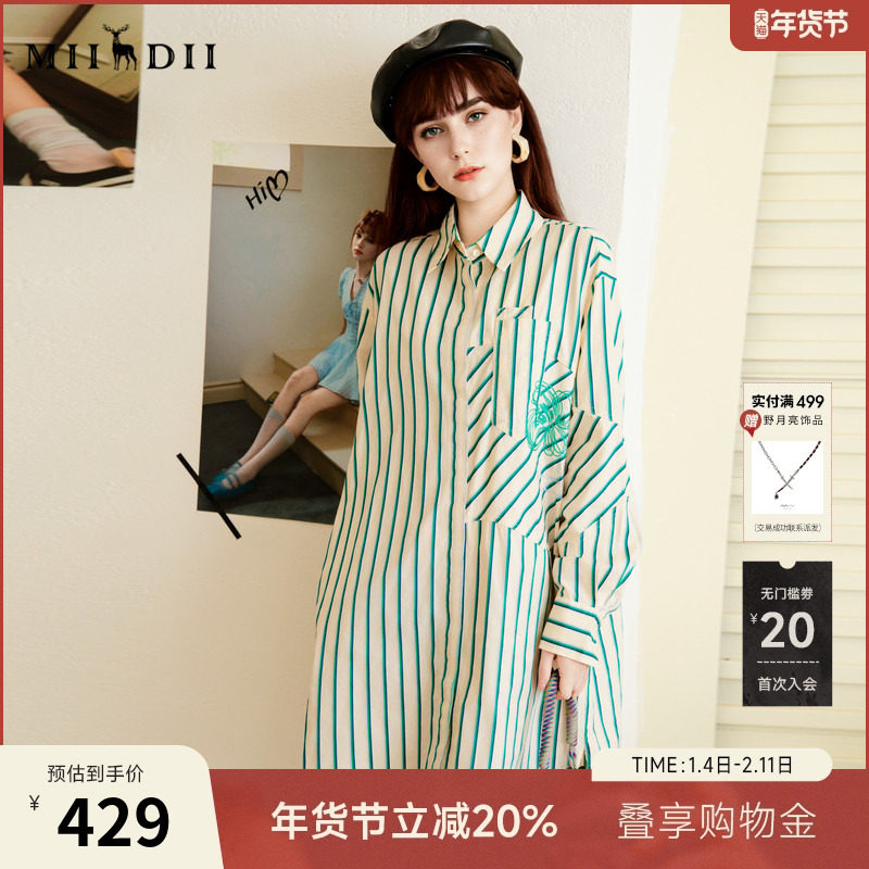 谜底条纹衬衫裙长袖女2025秋季新款复古宽松中长连衣裙256ML6240