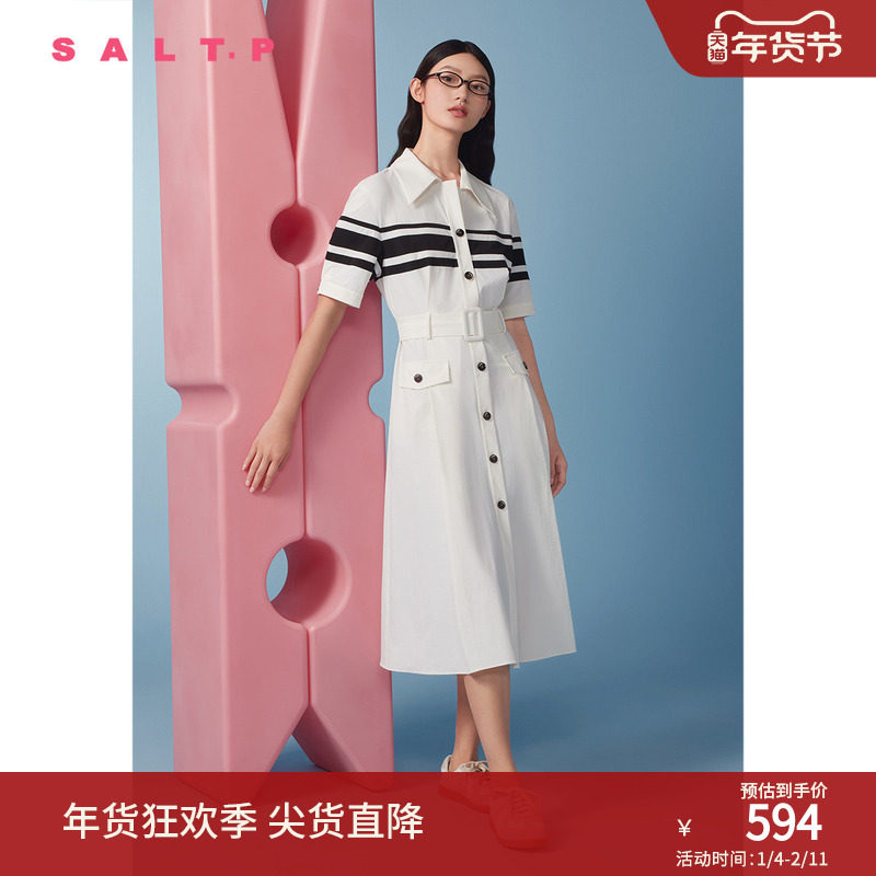 SALT.P可颜撞色翻领高腰学院风条纹衬衫裙连衣裙2024夏