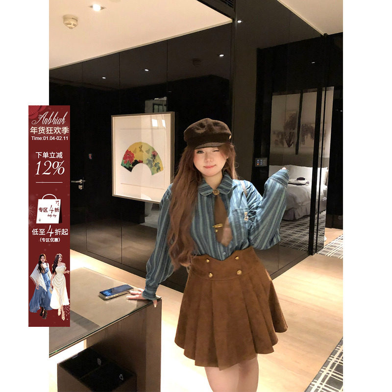 安妮不火 牛仔条纹衬衫麂皮半身裙套组女微胖大码美式复古两件套