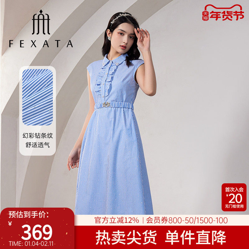 FEXATA斐格思2025夏季新品收腰miu系蓝白条纹衬衫裙中长连衣裙