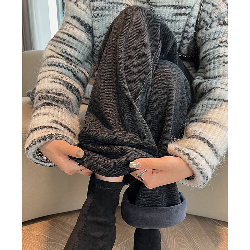 燕麦色裤子女秋冬2024新款高腰直筒加厚毛呢开叉人字纹加绒阔腿裤