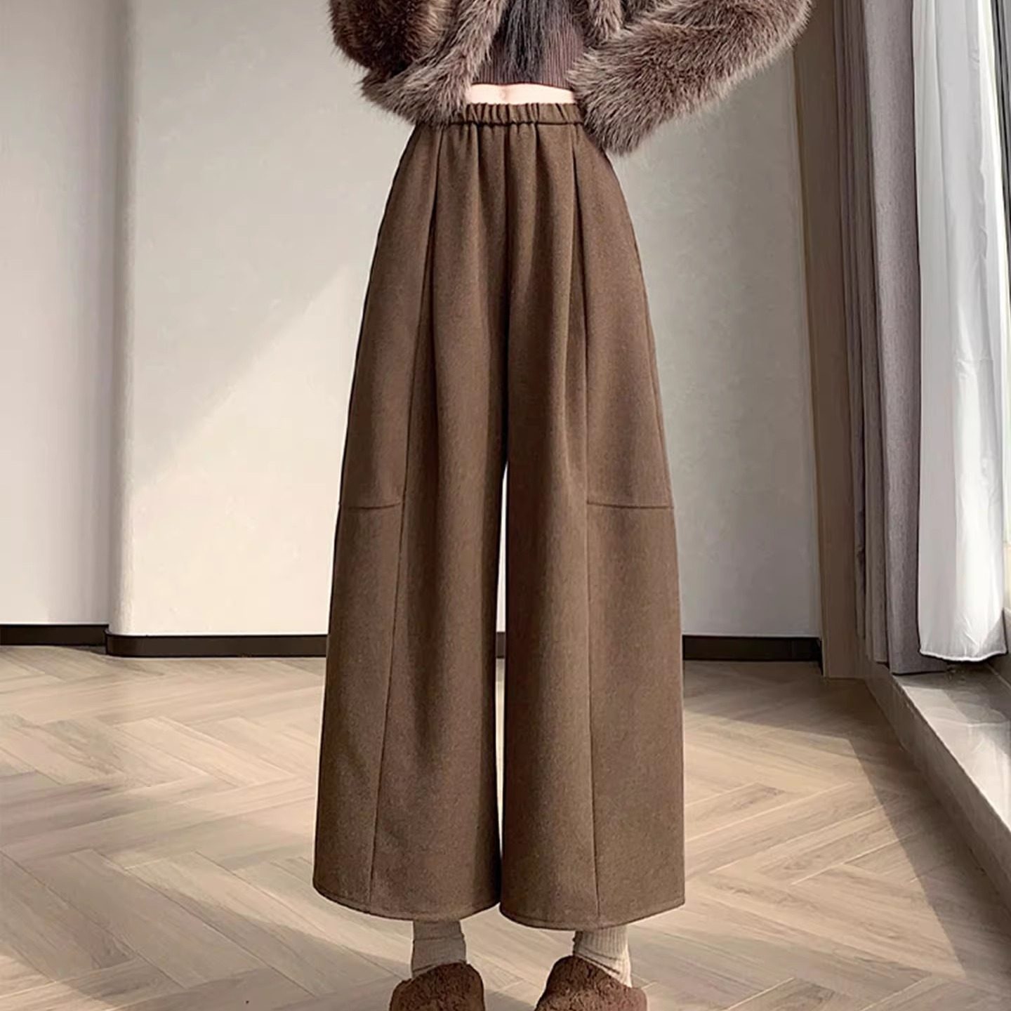 加绒棕色裤子女秋冬高腰直筒镰刀萝卜加厚羊毛宽松毛呢阔腿香蕉裤