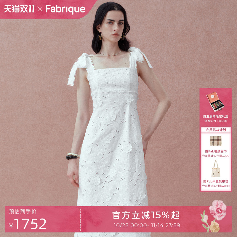 Fabrique纯棉镂空刺绣手工绑带波嬉连衣裙2025夏季新品方领吊带裙
