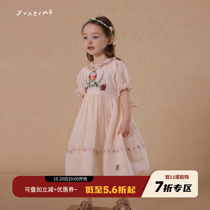 允儿妈女童纯苎麻手工刺绣连衣裙宝宝夏季复古法式长裙儿童裙子潮