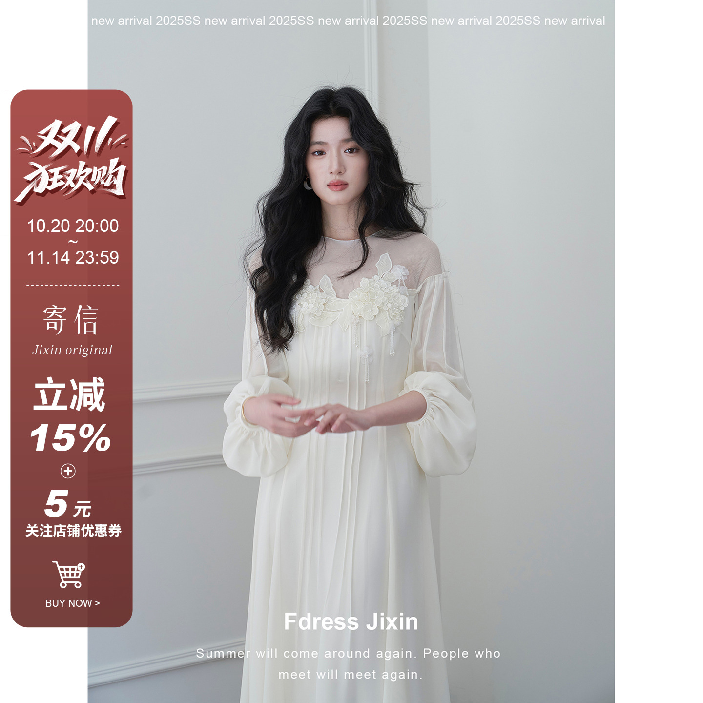 寄信《花语》网纱拼接/手工钉珠刺绣浅米白长裙微宽松气质连衣裙