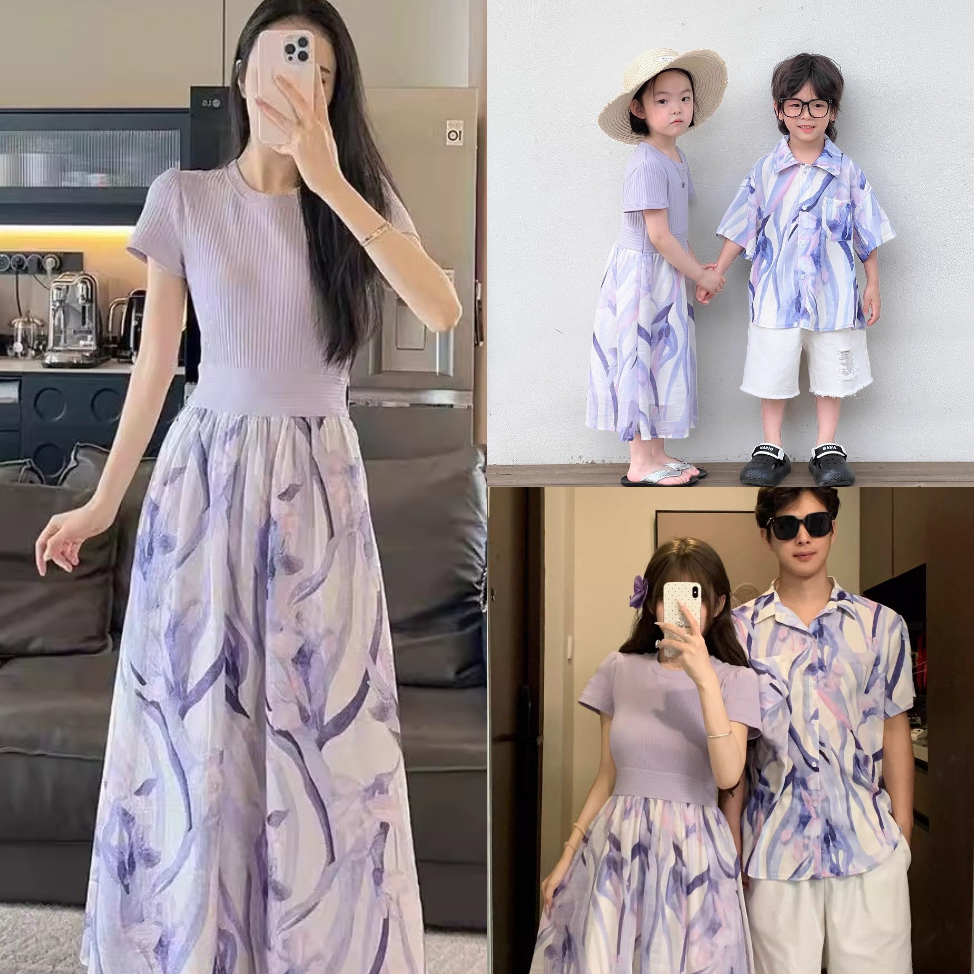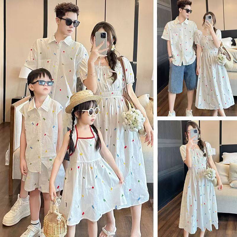 现货高级感休闲亲子装一家三口海边度假花衬衫夏天母子套装连衣裙
