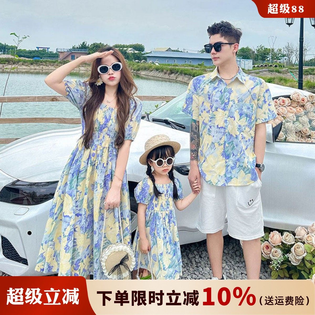 亲子装一家三口夏季母子海边度假印花衬衫母女速干薄款沙滩连衣裙