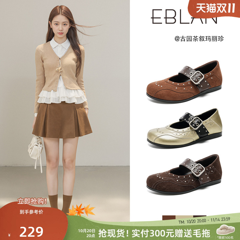 EBLAN/伊伴复古钉珠玛丽珍女鞋2025秋季新款法式歪头芭蕾舞单鞋子