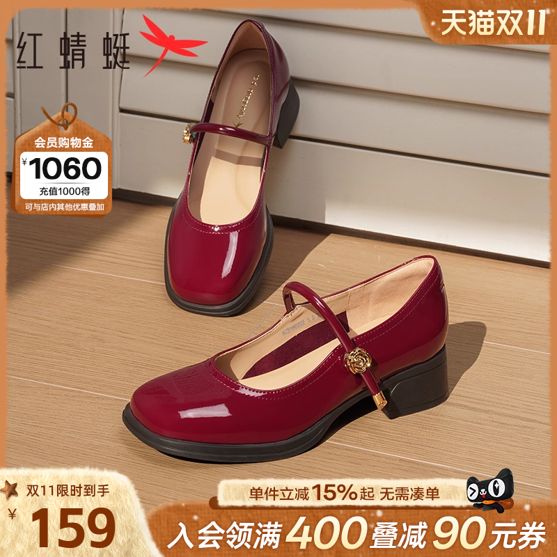 红蜻蜓红色玛丽珍女鞋2025新款粗跟单鞋不累脚高跟鞋法式婚鞋皮鞋