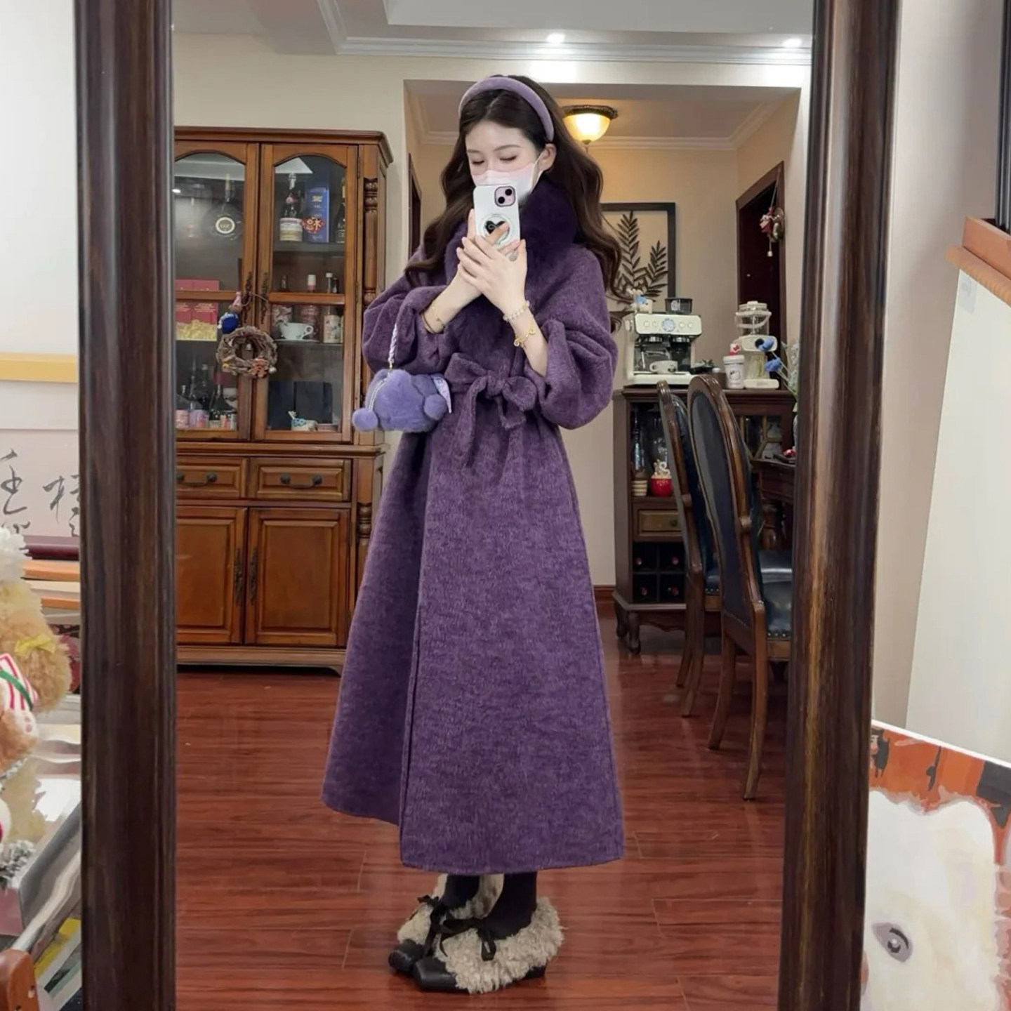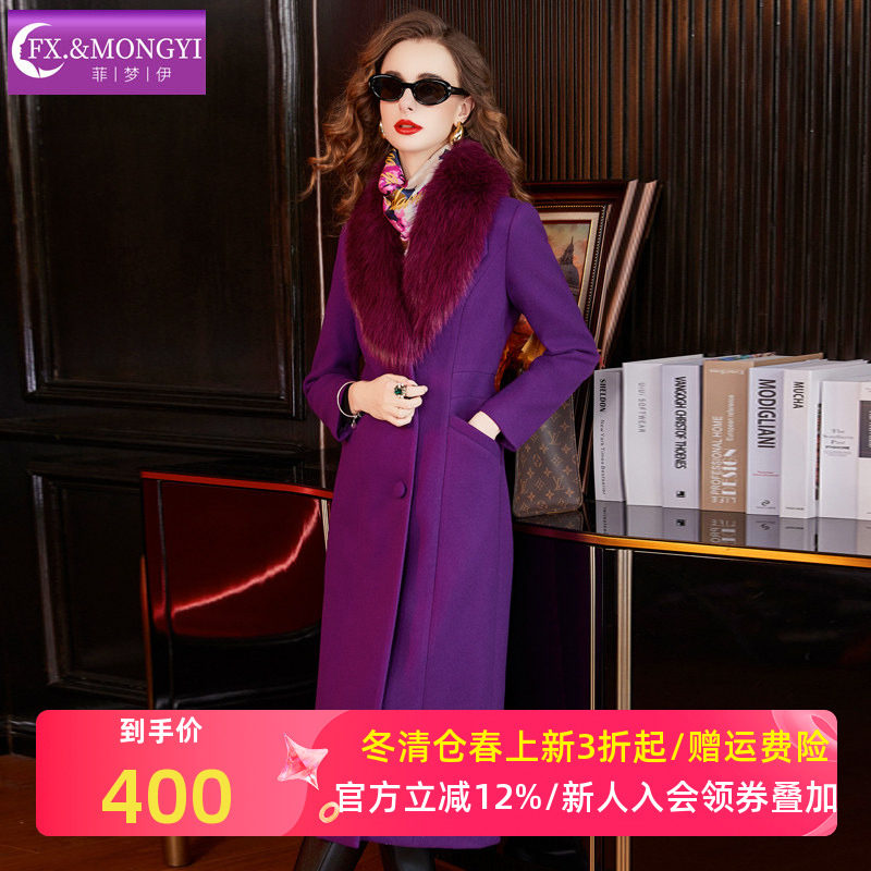 菲梦伊大毛领紫色毛呢外套女冬季轻奢高端贵妇加厚修身中长款大衣