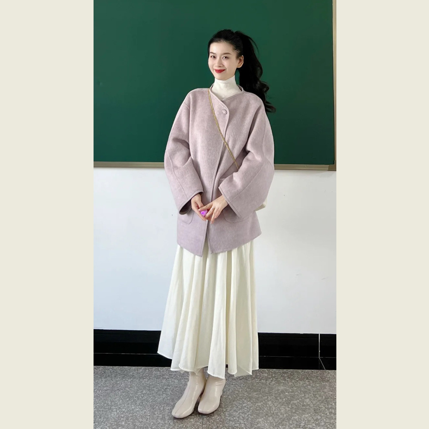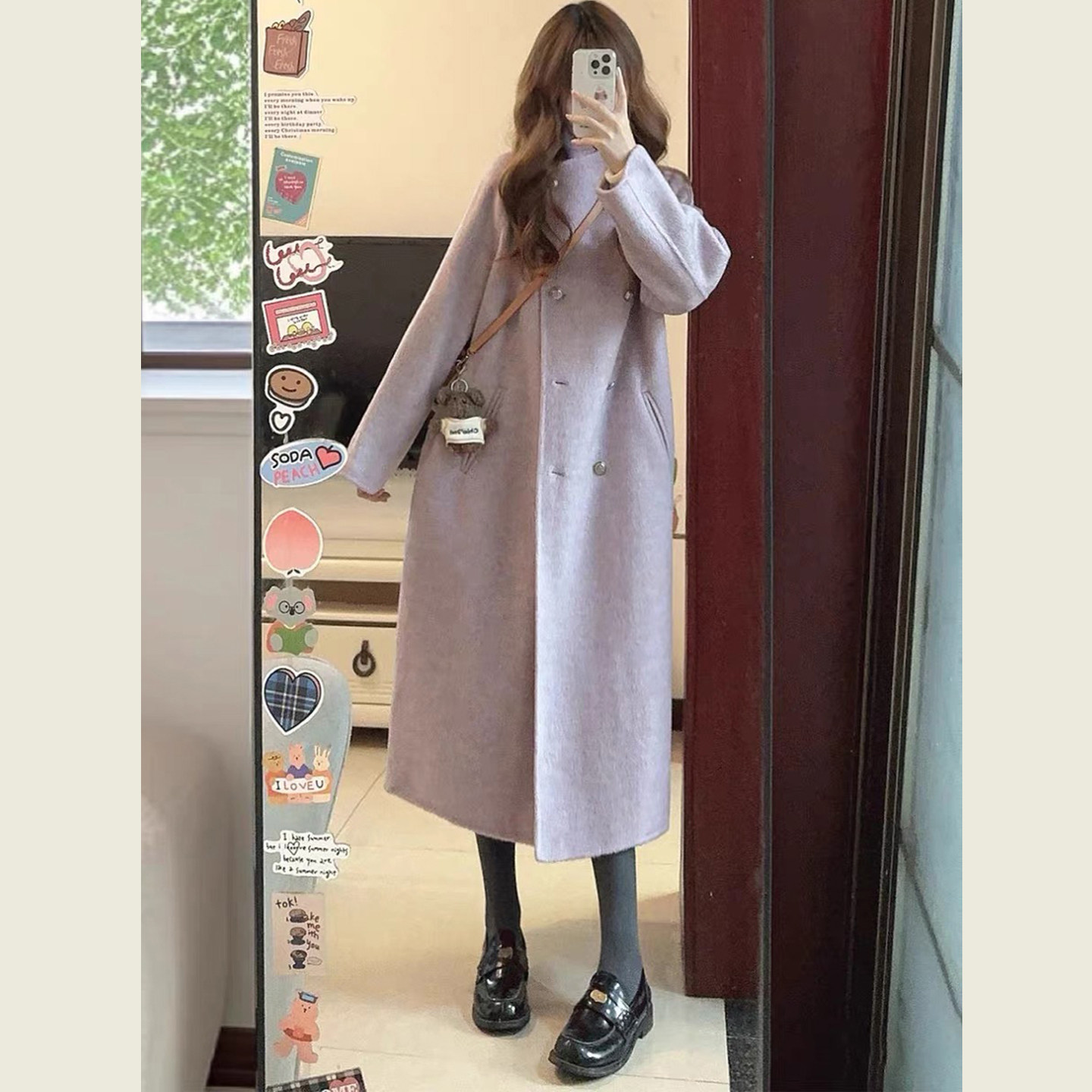2025韩版紫色通勤双面羊绒羊毛呢子大衣女中长款保暖毛呢外套加厚