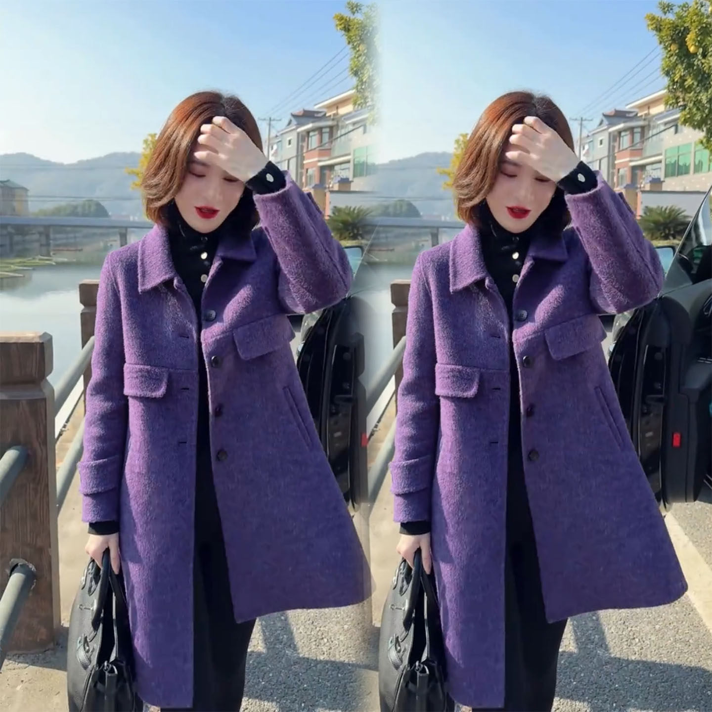 秋冬季韩版学院风紫色仿毛呢大衣女高级感中长款显瘦保暖翻领外套
