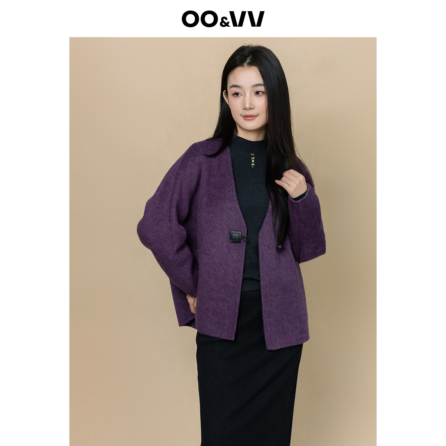 oo&vv时尚极简风轻奢一粒扣紫色高雅毛呢外套女中长款双面呢大衣