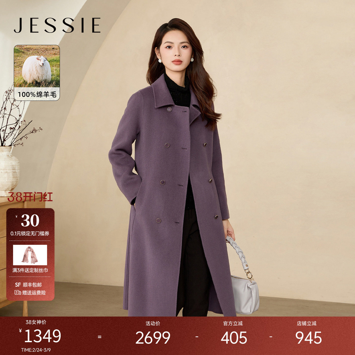 JESSIE紫色100%绵羊毛双面呢毛呢外套女冬新款中长款呢子大衣