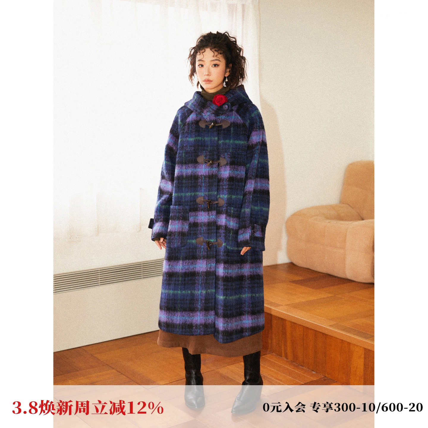 化学少女「黎鸣」复古学院紫色格子渔夫羊毛大衣中长款毛呢外套冬