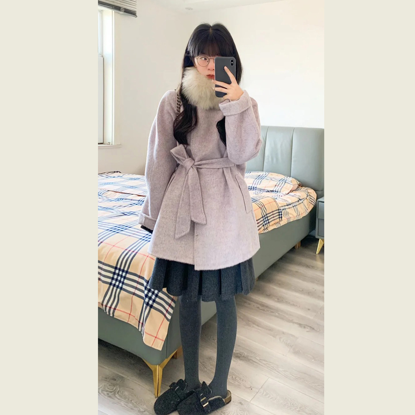 韩系赫本风紫色呢子大衣女秋冬新款系带小个子中长款毛呢外套加厚