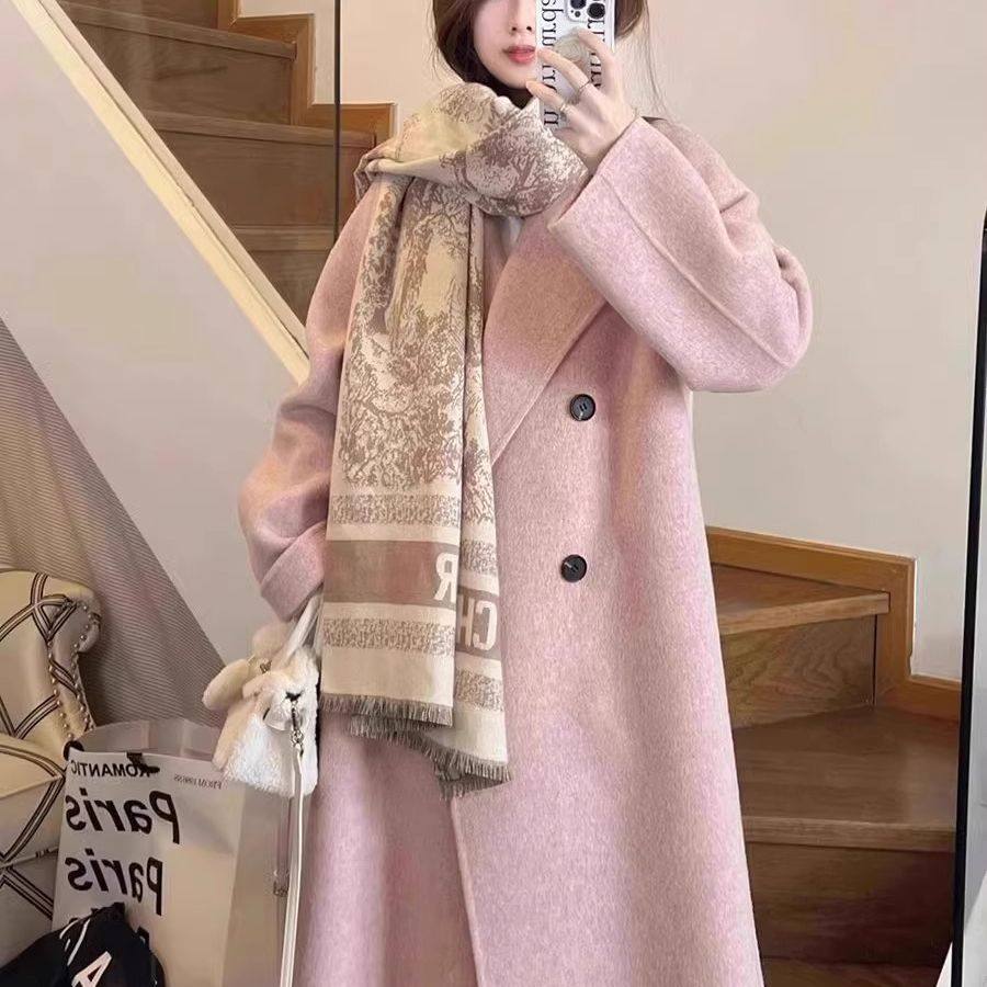 紫色围巾双面羊绒大衣女中长款2025秋冬新款韩系气质羊驼毛呢外套