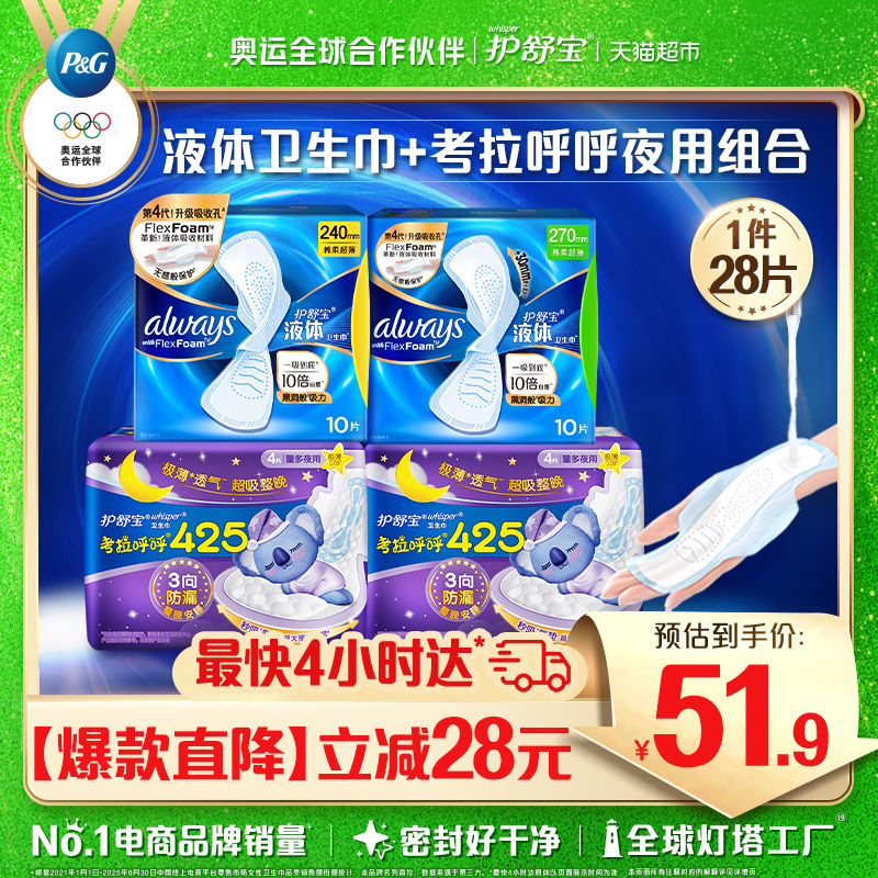 护舒宝考拉呼呼425mm360mm组合超长夜用卫生巾34片官方旗舰店