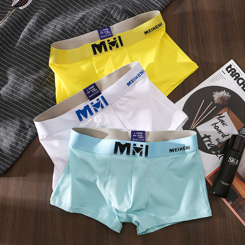 3条男士内裤男纯棉透气平角裤个性潮流布标青年纯彩色四角短裤衩