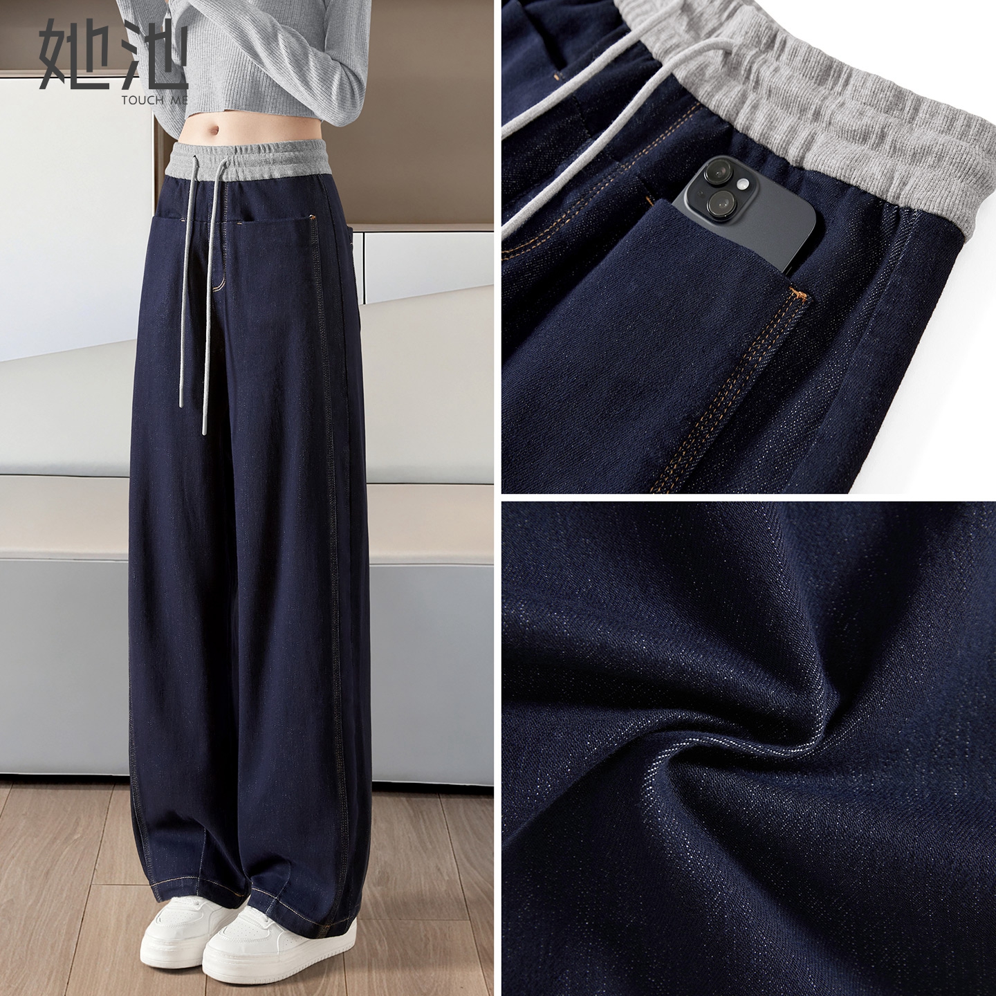 她池松紧腰牛仔裤2025冬装新款女装时尚撞色抽绳水洗磨毛哈伦裤