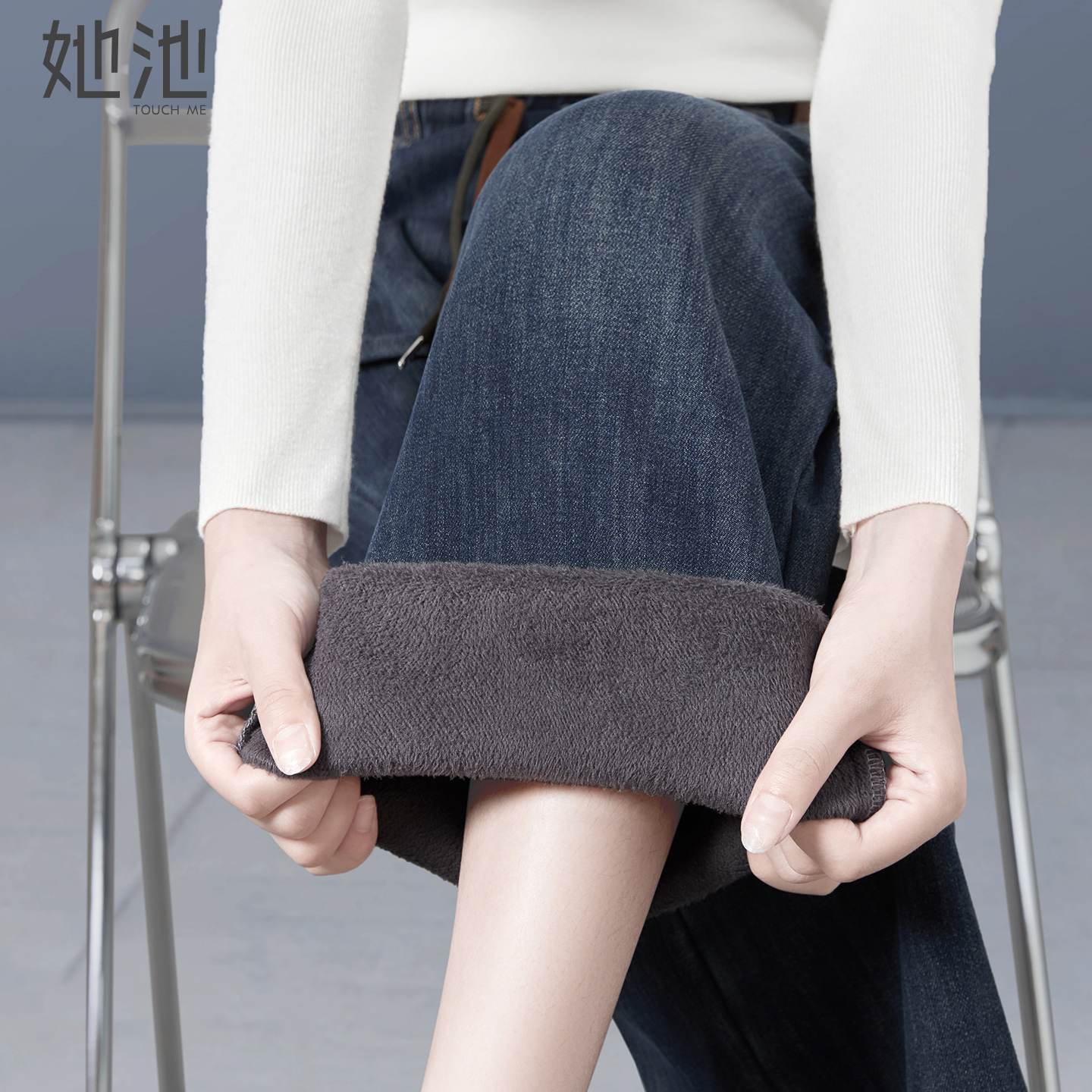 她池加绒牛仔裤2025冬装新款女装时尚减龄高腰水洗修身长款微喇裤