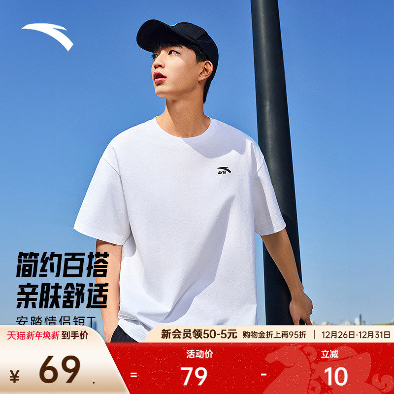 安踏短袖t恤男女同款夏季简约纯色圆领半袖宽松透气情侣休闲上衣