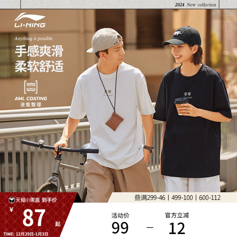 李宁短袖男士夏季官方半袖情侣装运动上衣男装体恤宽松白色T恤女