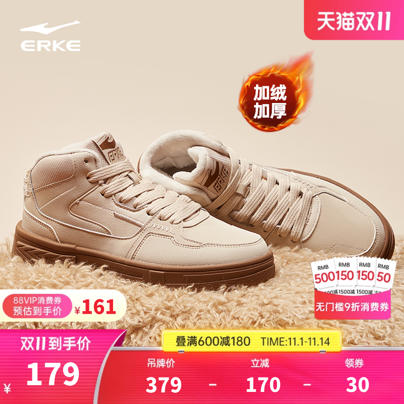 鸿星尔克板鞋女鞋冬季高帮运动鞋厚底鞋子皮面休闲鞋加绒保暖棉鞋