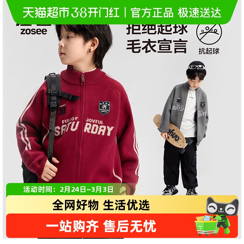 左西童装男童毛衣外套秋冬2025新款儿童红色洋气针织开衫大童冬装