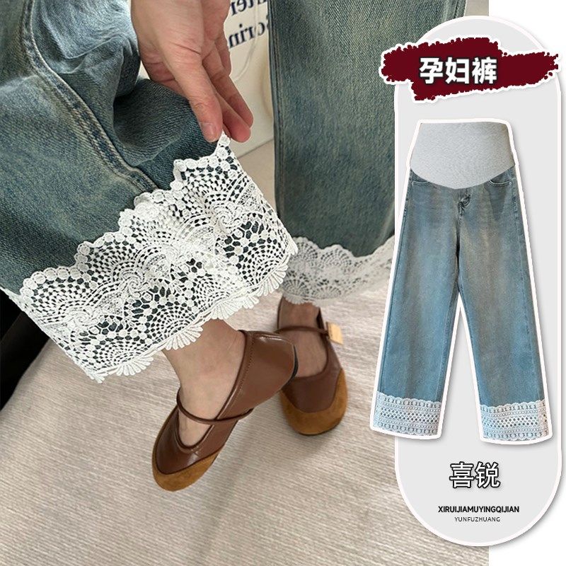 孕妇花边牛仔裤秋冬外穿阔腿裤加绒无托腹高级不勒肚子孕妇裤冬季