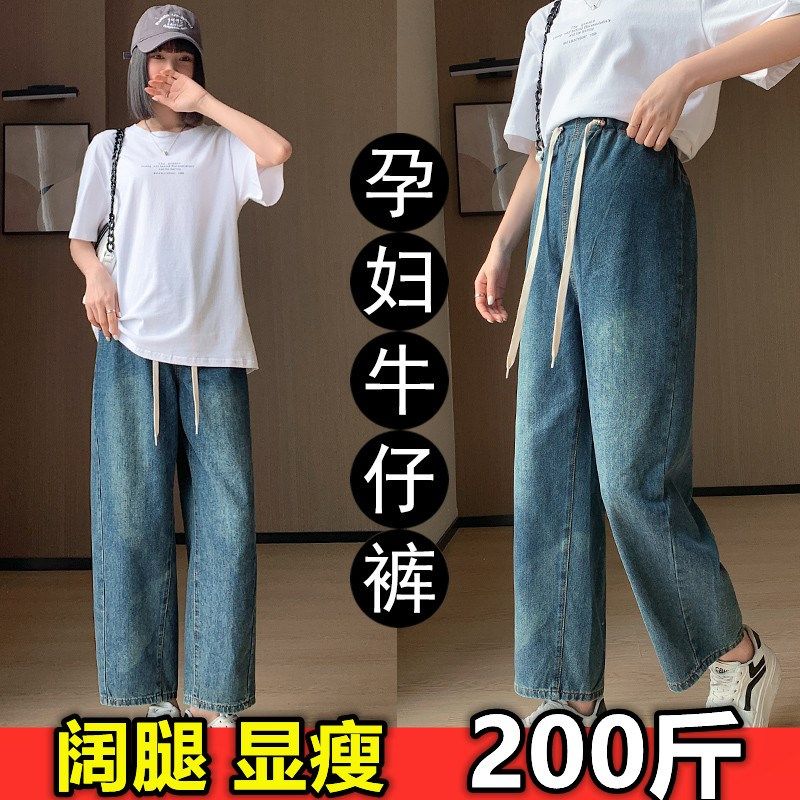 大码孕妇无托腹牛仔裤春秋季小个子百搭阔腿裤抽绳休闲长裤200斤