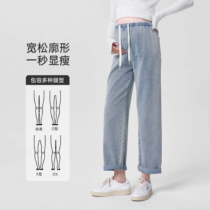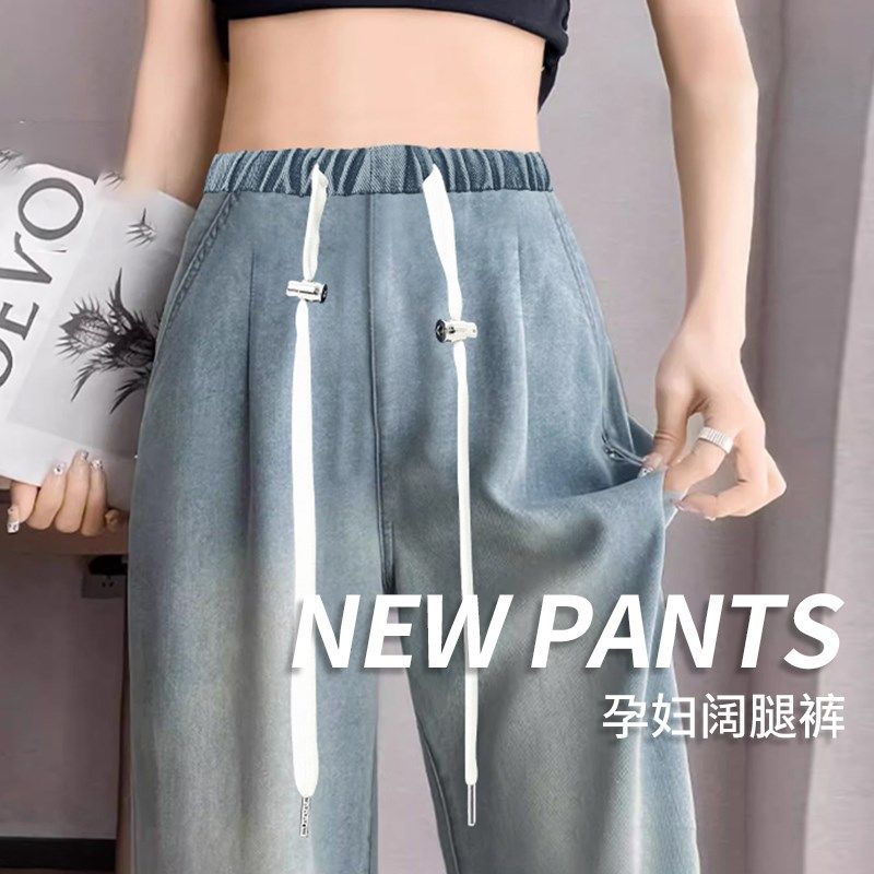 孕妇裤子夏季薄款外穿无托腹牛仔裤宽松时尚阔腿九分裤抽绳直筒裤