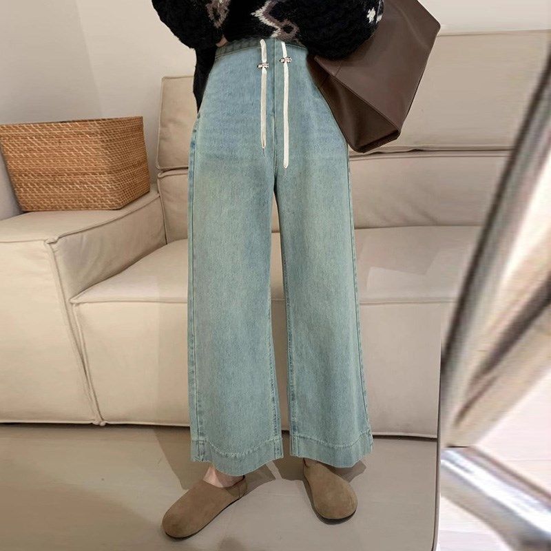 孕妇裤子无托腹牛仔裤外穿阔腿裤新款秋装抽绳松紧腰不勒肚休闲裤
