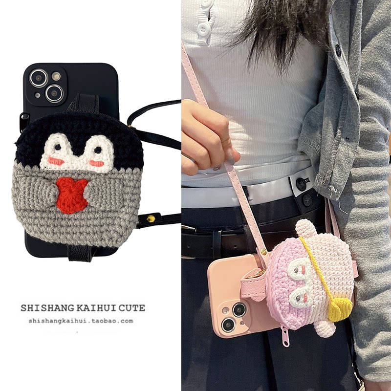 毛线企鹅零钱包腕带适用苹果15手机壳iphone14plus背带13promax斜挎挂绳11/12mini防摔软xs/xr女款6s/7/8plus