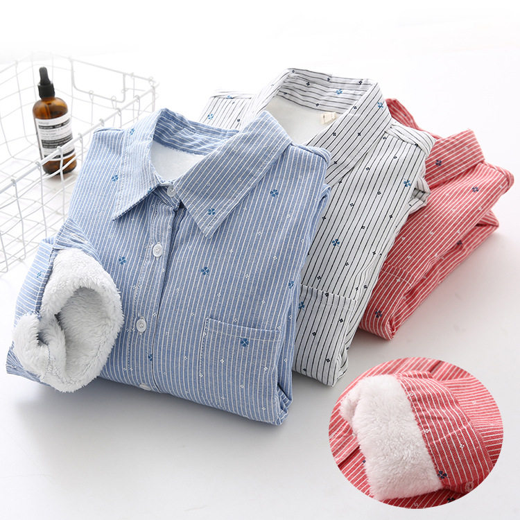 冬装新款韩版百搭长袖加绒加厚衬衫女学生保暖纯棉上衣全棉条纹衫